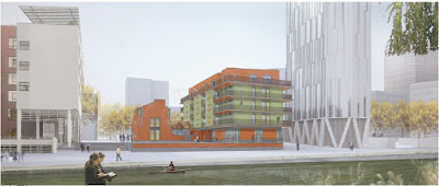 Le projet a été conçu par l’agence d’architecture Vincen Cornu à Paris qui a voulu exprimer les 3 composantes du programme. L’ensemble d’habitation est une simple « nef » disposée de manière à offrir un rapport avec le canal au nord et avec la place Andrée Viollis au sud.