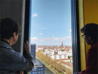 « On dirait des jouets » s’exclame Mme. E, en montrant les voitures ; les Blacks Swans ont perdu la pesanteur qu’on peut ressentir en marchant le long des façades sombres ; et Mme. MT de renchérir : « la Cathédrale, je la vois d’ici ! » ; « et si l’ascenseur tombe en panne ?». « Magnifique… mais je ne voudrais quand même pas habiter si haut »… Merci, Mathilde».