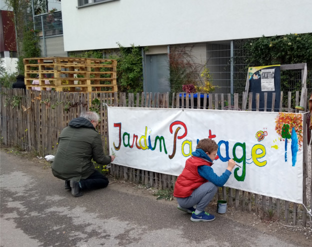 Petits et grands ont trempé des pinceaux de toutes tailles dans les couleurs primaires pour créer un joyeux mélange de styles et aboutir à la réalisation artistique qui orne la palissade du jardin partagé.